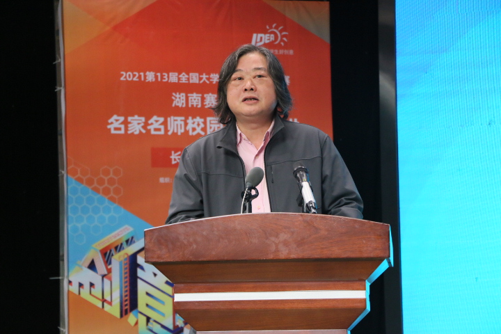 然后,湖南师范大学王战教授作赛事指导。他重点讲解了今年的参赛规则、参赛类别、具体流程、评选规则,并鼓励同学们通过新媒体进行创作。