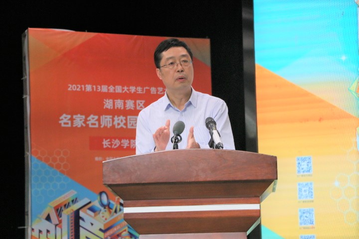 5月18日下午,由全国大学生广告艺术大赛(以下简称:大广赛)湖南赛区组委会主办、长沙学院承办的第十三届大广赛湖南赛区名家名师校园创意巡讲活动在力行楼演播厅顺利开展。长沙学院教务处处长杨建宏教授,湖南师范大学王战教授,华侨大学硕士生导师江绍雄教授以及大广赛五大品牌商负责人出席本次巡讲。此外,来自影视艺术与文化传播学院、艺术设计学院的参赛师生,参与本次活动。
