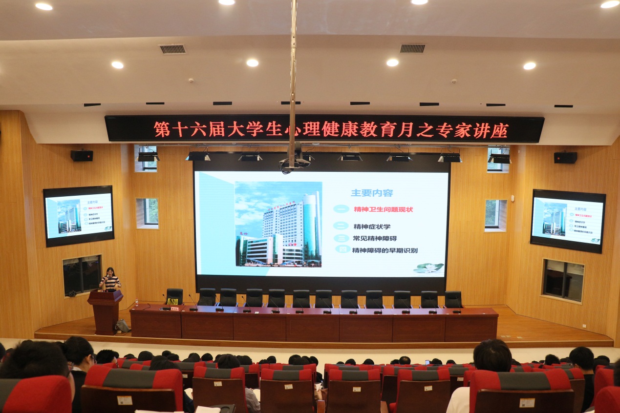 本次讲座以“大学生常见心理疾病的识别”为主题,陈金虹副主任医师从精神卫生问题现状、精神症状学、常见精神障碍、精神障碍的早期识别四个方面进行了介绍。