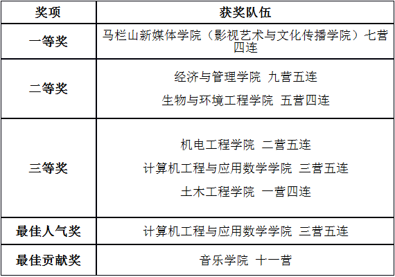 最终,六支团队喜获佳绩,其中马栏山新媒体学院(影视艺术与文化传播学院)七营四连凭借真挚动人的表演夺得一等奖。计算机工程与应用数学学院三营五连在线上平台获得大众关注与欢迎,荣获最佳人气奖。