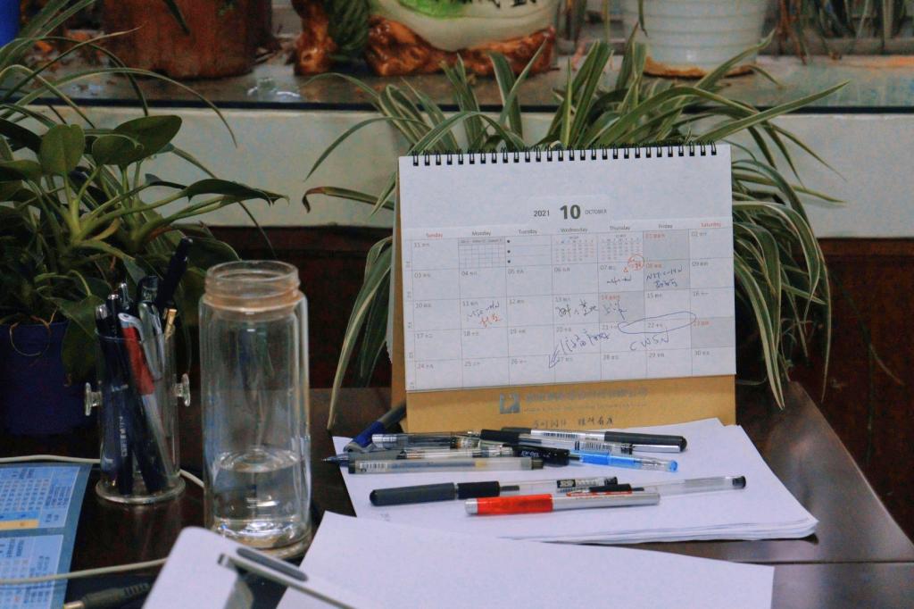 朱培栋的办公桌上摆满了各种书籍、文献资料和各种待处理的文件,桌上的日历上密密麻麻地标明了每天的日程安排和工作计划。他的一天基本上都排得满满当当,从早上7:00多开始,一直工作到晚上11:00多才结束,最长的时候会持续到深夜12:00多。