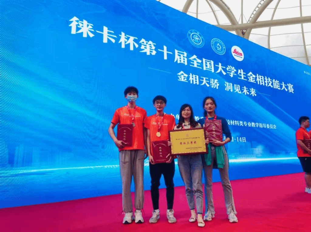 2021年10月,由教育部材料类专业教学指导委员会主办、上海交通大学承办的第十届全国大学生金相技能大赛在上海交通大学举行,经过激烈角逐,我校机电工程学院在本届大赛中获得了历史性突破,由三名队员组成的参赛队伍荣获“团体三等奖”。其中李侃荣获个人一等奖,周英荣获个人二等奖,胡凯源荣获个人三等奖,夏琳燕和熊汉青两位老师荣获“优秀指导老师”。