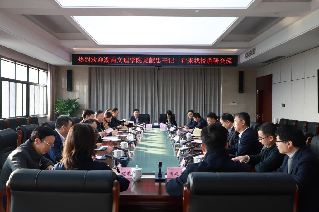 11月19日上午,湖南文理学院党委书记龙献忠一行10人来我校调研交流。调研座谈会在综合楼4001会议室举行,党委副书记、校长黄立宏主持会议。