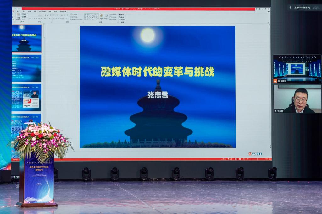 本次发展高峰论坛主题演讲部分主要围绕“加快推进马栏山新媒体学院建设发展”进行交流,探讨新时代地方高校现代传媒产业学院体制机制建设、师资队伍建设、人才培养、政产学研深度融合与协同育人、以及新时代新媒体教育的前景等议题。十余位专家学者和业界大咖发表演讲。马栏山新媒体学院院长黄柏青主持主题演讲部分。