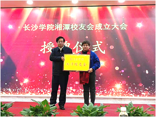 成立大会在庄严的国歌声中拉开序幕,所有参与师生共同观看长沙学院宣传片,感受母校的翻天巨变。学院招生与就业指导处副处长朱智宇宣读了《关于同意成立长沙学院湘潭校友会的批复》;通过了《长沙学院湘潭校友会章程》,副校长陈世平为湘潭校友会授牌。2000级影视广告专业彭晗当选校友会会长, 91级湘江师范特教专业谷柳当选常务副会长,胡丽星、彭章等7名校友当选副会长,招生与就业指导处处长谷建春为当选湘潭校友会管理机构成员颁发证书。