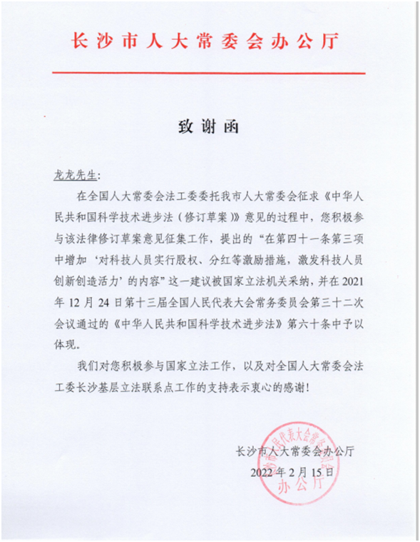 2021年9月,我校法学院龙龙副教授就《科学技术进步法(修订草案)》所提的修法建议被全国人大常委会采纳,并在最终公布的法律条文中予以体现。近日,长沙市人大常委会办公厅专门为其发来致谢函。
