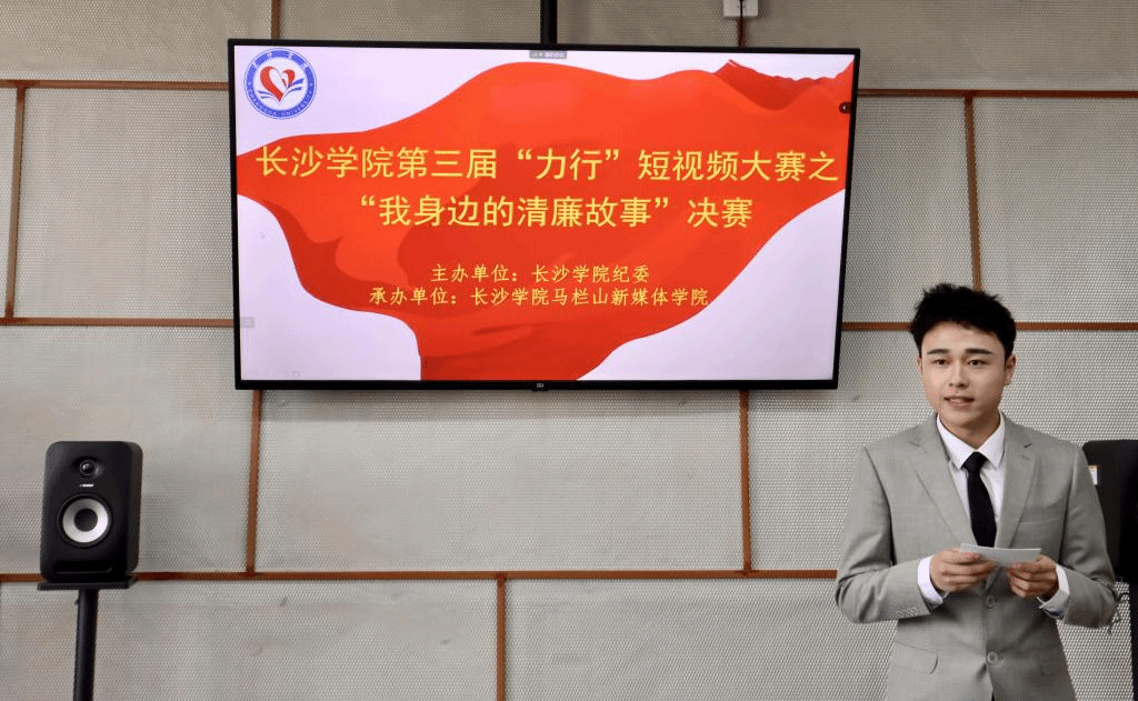 “行‘清’之风,建‘廉’之校,欢迎来到‘我身边的清廉故事’短视频大赛的决赛现场……”4月19日下午,由纪委办主办、马栏山新媒体学院承办的第三届“力行”短视频大赛之“我身边的清廉故事”决赛在力行楼A509成功举行。学校纪委副书记、纪委办主任贺革,马栏山新媒体学院党总支书记徐长梅出席,纪委办副主任阮宏伟、马栏山新媒体学院编导教研室主任张乃午、摄影教研室主任易为联袂担任决赛评委。