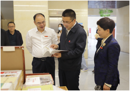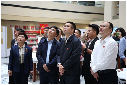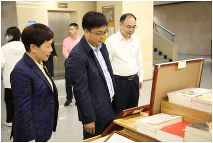 高友根、胡卫兵一行来到学校的清廉空间和清廉书法比赛获奖作品展参观。丁文介绍了由廉洁文化展示区、廉洁书籍阅读区和“书记说清廉”视听区等三个板块组成的清廉空间。一面清廉文化墙,以清新淡雅为基本格调,注入“清爽荷花”等元素,涵盖党风清廉、校风清明、教风清正、学风清新、文化清朗等内容;廉洁书籍阅读区由六组书架和四组阅读桌椅构成,书架上摆放以廉洁为主题的书籍千余本;“书记说清廉”视听区循环播放学校每位党组织书记讲述对清廉长大建设的认识、设想的短视频。通过打造清廉空间,营造了“处处是课堂,时时悟廉洁”的浓厚学廉氛围。在图书馆大厅集中展示了百余幅清廉书法比赛获奖作品,艺术设计学院的书法家们现场挥毫,书写了多幅以清廉为主题的书法作品。