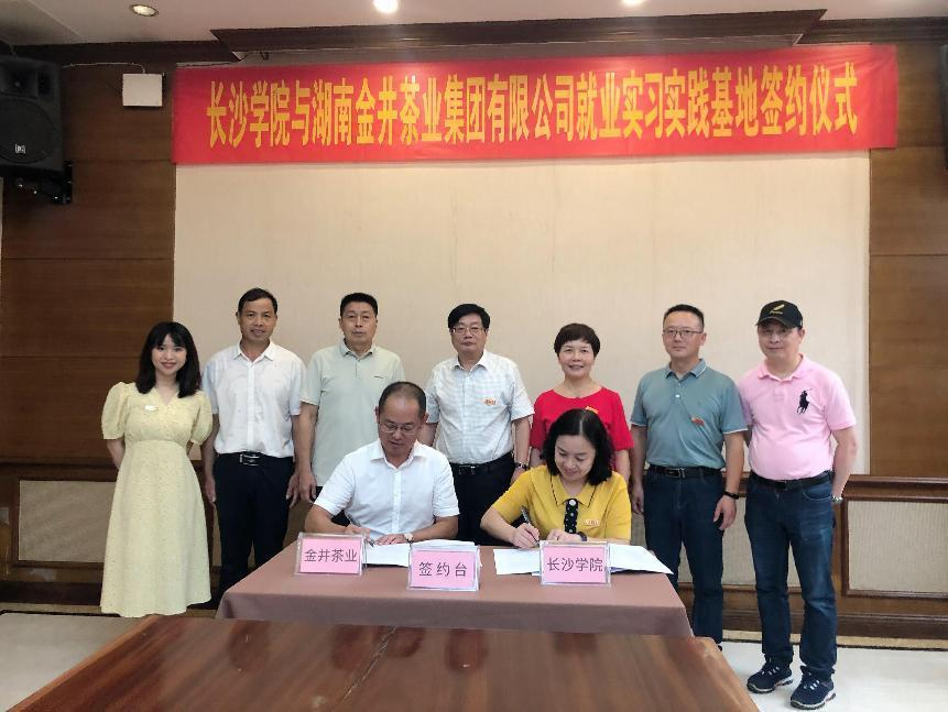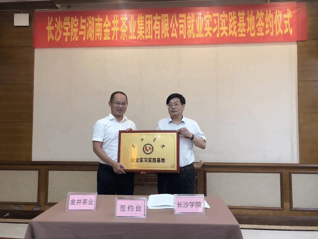 陈世平、丁文一行参观了湖南金井茶业集团有限公司展厅和茶园,并与公司负责人进行了座谈交流。座谈会上,公司总经理、优秀校友周宇介绍了企业的发展历程、基本情况、并诚挚表达了对母校毕业生的青睐。陈世平、丁文也热情地介绍了学校的办学定位、人才培养模式及特点,并表达了与企业构建长期校企合作关系的意愿。会上双方就深度合作达成意向,陈世平和周宇共同为长沙学院就业实习实践基地牌匾揭牌,招生与就业指导处处长谷建春与周宇签署了就业实习实践基地协议书。