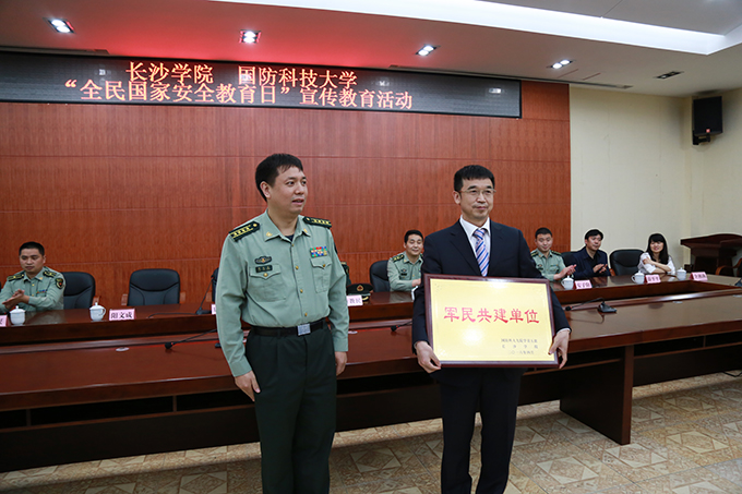 上午10:00,两校联合举办的"全民国家安全教育日"学习宣传活动启动仪式暨"军民共建单位"受牌仪式在我校图书馆一楼会议室举行。周明侠副院长代表学校授牌。同时,为将工作落实,国防科大指挥军官基础教育学院五旅还在我校机电工程系挂牌建立"青年志愿者服务合作点"。周明侠为活动致辞,他说当今世界环境风云变幻,中国所面临的国际形势也日益严峻。国家安全,人人有责,在大学生中深入开展国家安全宣传教育具有重要意义。他表示,我校将进一步加强与国防科技大学合作,充分发挥"国防安全教育基地"的教育示范作用。