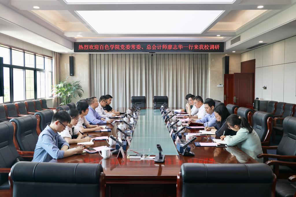 廖志华从历史沿革等方面介绍了百色学院的办学特点和基本情况,并对我校在学科建设、财务、资产管理等方面的工作所取得的成绩给予了高度评价。随后,与会双方围绕办学经费筹措、预算管理、绩效评价、资产管理等方面进行了深入的探讨和经验交流,希望两校今后能加强联系,互相学习。
