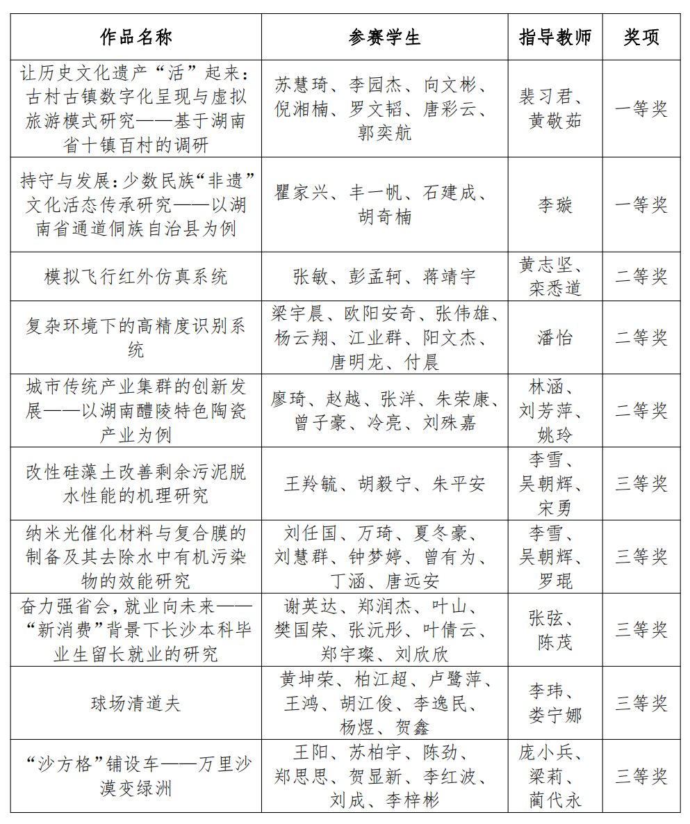 根据“挑战杯”竞赛规则,经济与管理学院裴习君、黄敬茹老师指导的《让历史文化遗产“活”起来:古村古镇数字化呈现与虚拟旅游模式研究》和音乐学院李璇老师指导的《持守与发展:少数民族“非遗”文化活态传承研究——以湖南省通道侗族自治县为例》两件哲学社科类作品作为我校首次获得该类别的省赛一等奖项目,将代表学校参加今年下半年在贵州大学举办的第十八届“挑战杯”全国大学生课外学术科技作品竞赛。