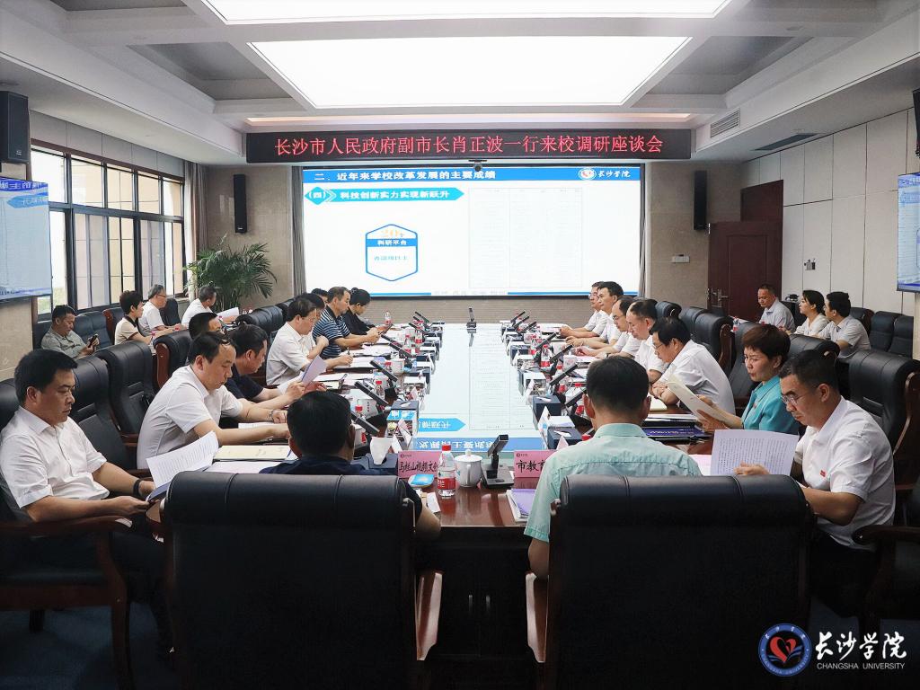 5月30日,长沙市人民政府党组成员、副市长肖正波一行到我校考察调研。长沙市政府副秘书长王新良,市教育局、市发改委、市财政局、市自然资源规划局、市住建局、开福区政府、马栏山视频文创园等相关单位负责人,学校全体校领导及相关处室负责人陪同调研并参加座谈。