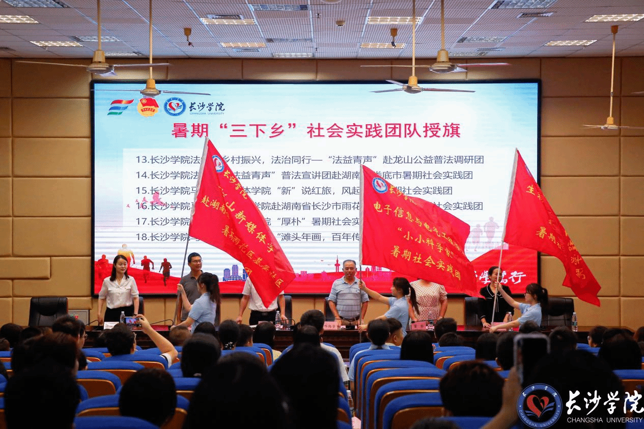 会上,全体社会实践团队指导老师庄严递交承诺书,学校为实践团队一一授旗,出征的号角已然吹响;校团委肖智、音乐学院李璇、生物与化学工程学院林涵等三位老师分别就社会实践是什么、怎么做和成果转化等进行专题培训,出征的行囊满满当当。“今天的活动就是加油站,老师的鼓励言犹在耳,培训课都是干货,我相信,一个意义非凡的夏天在等我!”马栏山新媒体学院2022级播音专业的陈佳丽同学分享道。