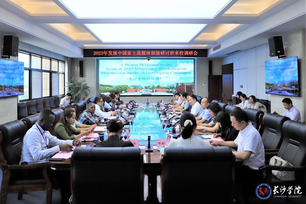 7月14日,根据国家广播电视总局研修学院的安排,委内瑞拉、塞拉利昂、哥伦比亚等来华参加2023年发展中国家主流媒体部级研讨班学员代表一行10人到我校进行考察调研。国家广播电视总局研修学院副院长刘林海、国际培训处处长朱家玓,湖南省广播电视局党组成员、副局长肖荣,校党委副书记、校长黄立宏,党委委员、副校长曾广胜,党委委员、副校长、马栏山新媒体学院党总支书记何利华陪同调研并参加座谈交流。调研会由肖荣主持。