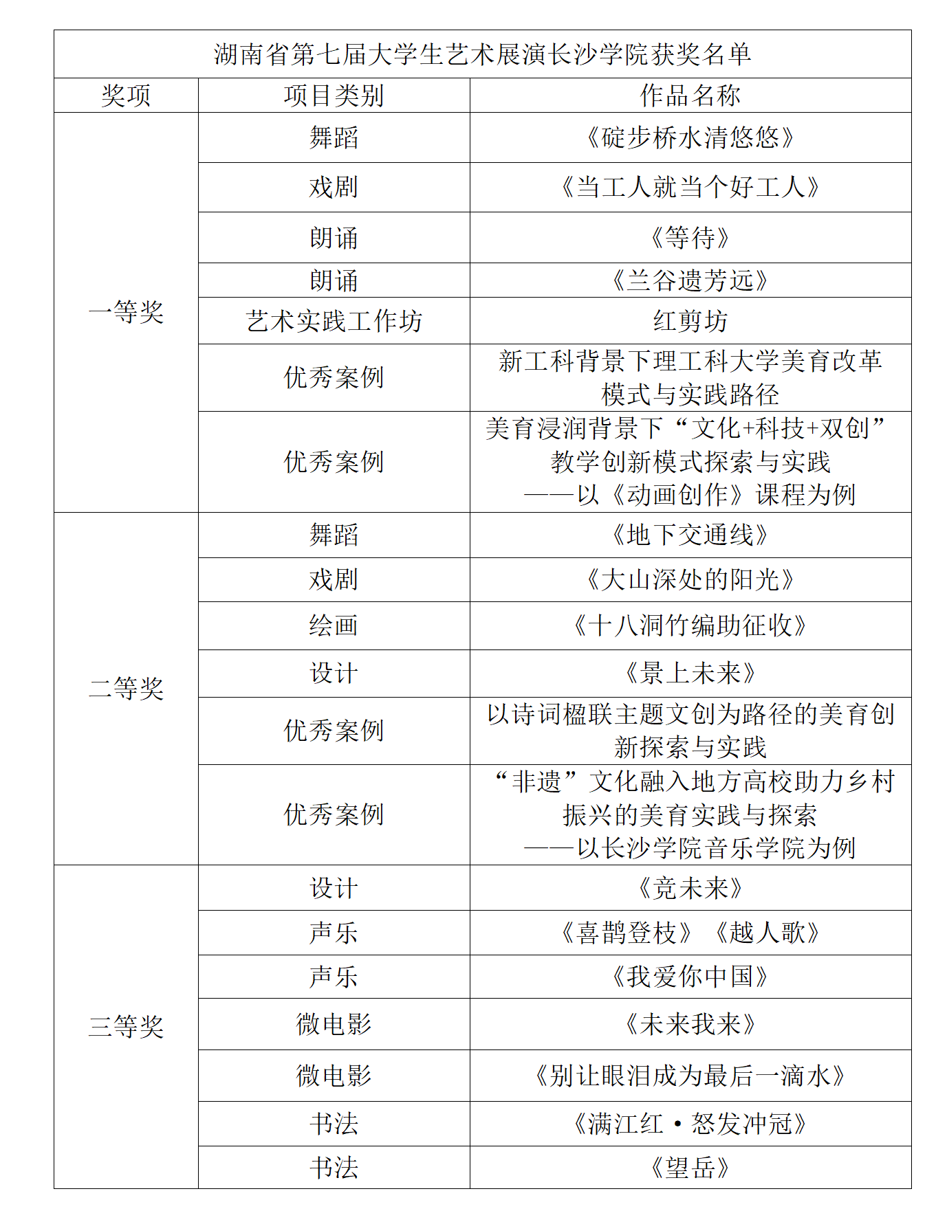 近日,由湖南省教育厅主办的湖南省第七届大学生艺术展演活动评审结果公布,我校共有20项作品获奖,获得一等奖7项、二等奖6项、三等奖7项。其中5项作品入围现场展演,3项作品入围国赛,创历届竞赛入围数量新高。