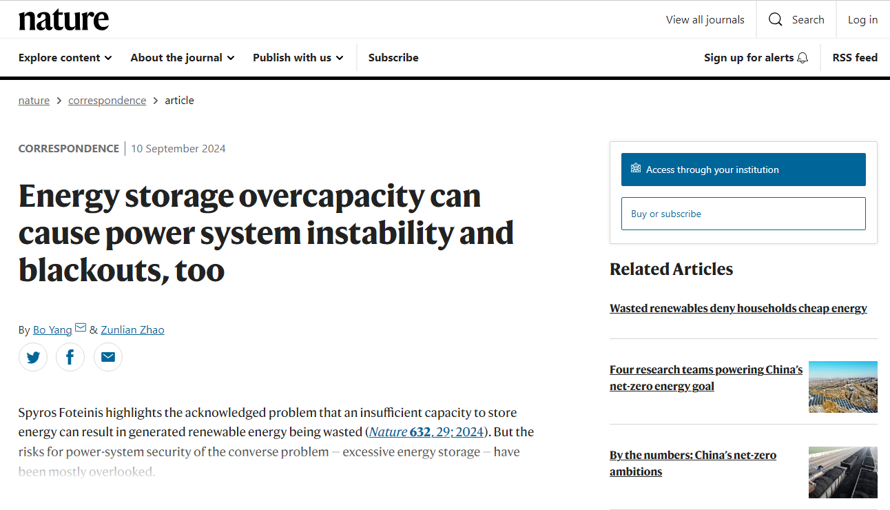 9月10日,国际顶级期刊《Nature》Correspondence栏目在线发表了我校电子信息与电气工程学院杨波教授的评论文章《Energy storage overcapacity can cause power system instability and blackouts,too》,这是我校首次作为第一完成单位、我校教师为第一作者和通讯作者在《Nature》正刊上发表文章,实现重大突破。