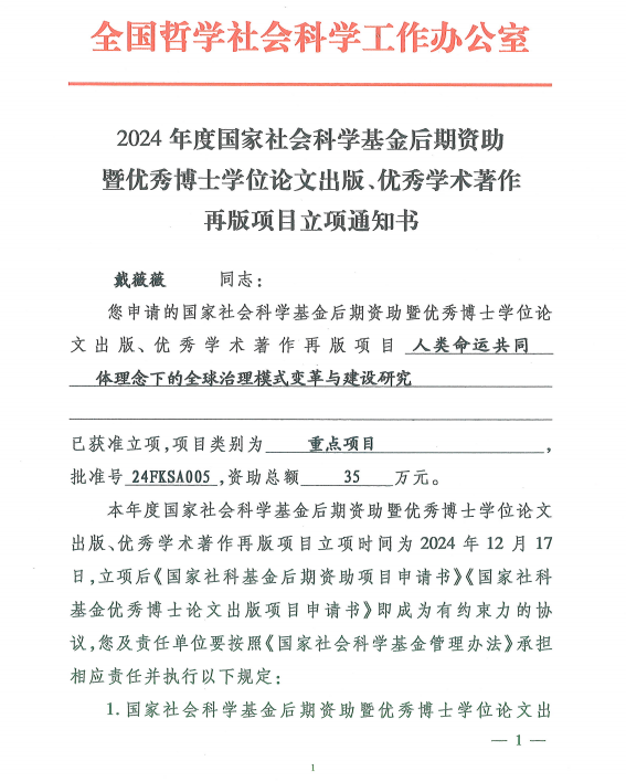 近日,全国哲学社会科学工作办公室公布了2024年度国家社科基金后期资助项目立项名单。我校马克思主义学院戴薇薇博士申报的《人类命运共同体理念下的全球治理模式研究》获批重点项目,实现了我校在该类别项目的新突破;经济与管理学院范香花博士申报的《民族旅游地区妇女幸福感影响机制及生成路径研究》获一般项目立项。至此,我校2024年度国家社科基金立项总数已达8项,其中重大项目1项,重点项目2项,创历年最佳成绩。