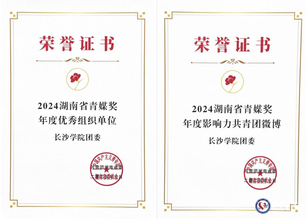 活动现场为75个优秀账号运营、产品制作、活动开展的单位和团队颁发了证书。其中,“长沙学院团委”微博获评“湖南省青媒奖·年度影响力共青团微博”,学校获评2024湖南省青媒奖年度优秀组织单位。