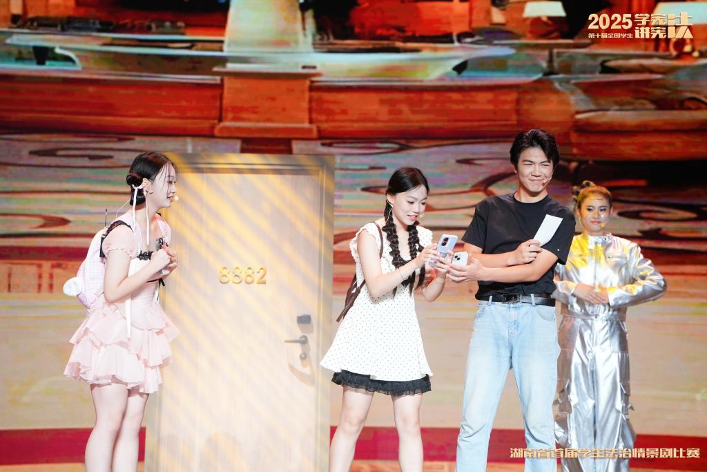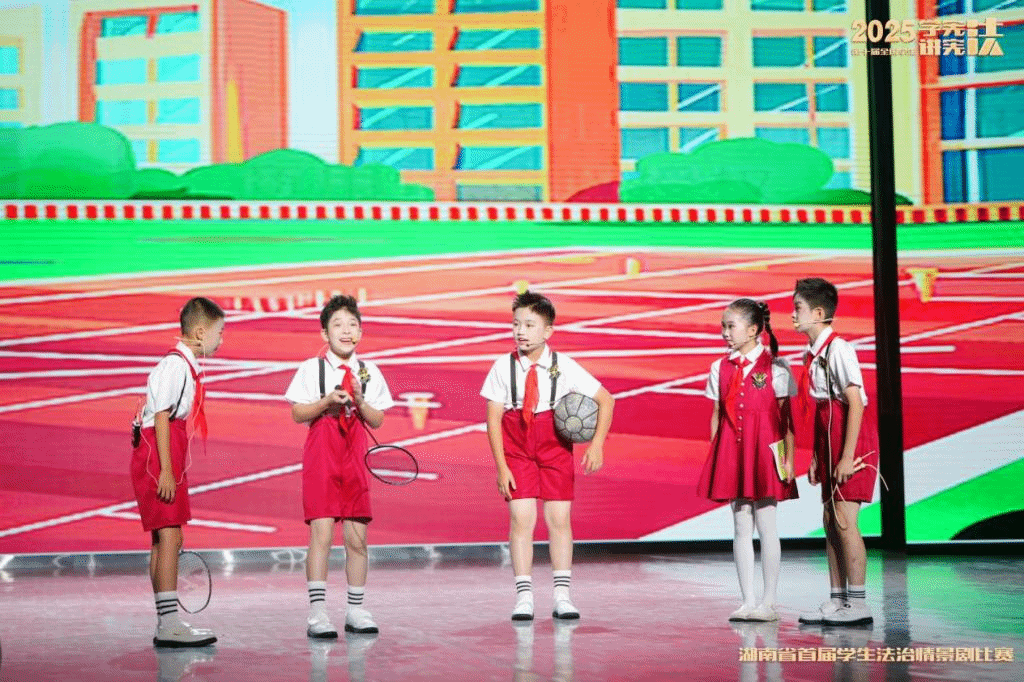 经过专业评审和现场竞演,本次比赛共评选出省级一等奖13 个、二等奖 21 个、三等奖 29 个,同时评选了 12 个优秀组织单位和38 名优秀指导教师。其中,株洲市芦淞区何家坳小学创作的《照亮角落的光》与我校选送的《敲打》两部作品,凭借深刻的主题挖掘、鲜活的人物塑造和专业的舞台呈现脱颖而出,将代表湖南省出征全国总决赛,展现湖湘学子的法治风采。
