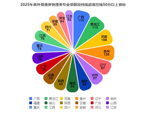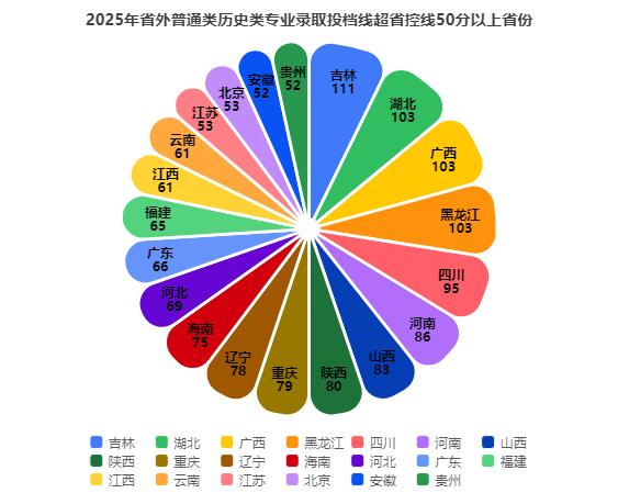省外招生情况方面,我校在70%以上的外省(市、自治区)投档分高出所在批次省控线50分以上,其中吉林、湖北、广西及黑龙江历史类,广西、黑龙江、河南及贵州物理类投档分均超出所在省份投档分100分。外省录取投档分超省控线50分以上的具体情况如图3和图4所示。