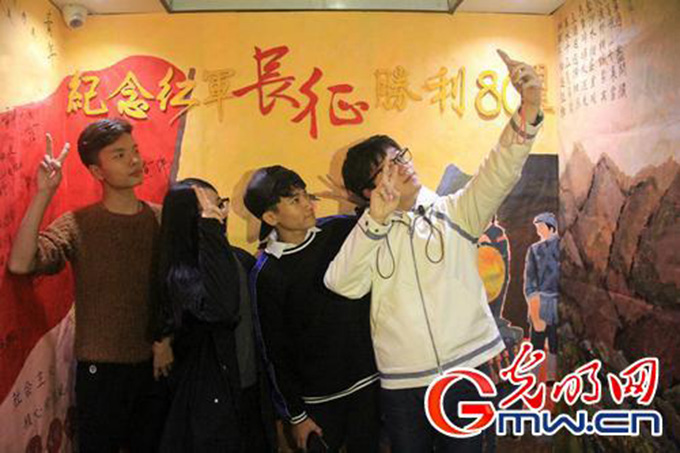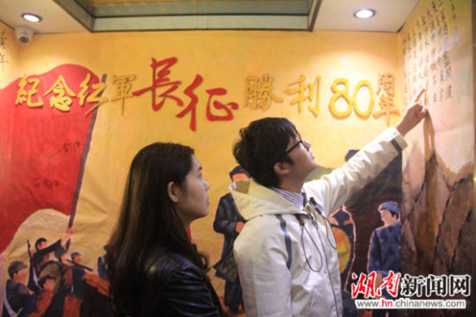 今天早上7点,长沙学院理工楼纪念红军长征主题电梯迎来了第一波“乘客”。踏进电梯,“纪念长征胜利80周年”几个大字映入眼帘,与梯壁上的毛泽东同志的《七律·长征》交相辉映。“乘客”们被墙上的诗句吸引,情不自禁地跟着吟诵,还有“乘客”在梯壁上的签名旗上签下感言。