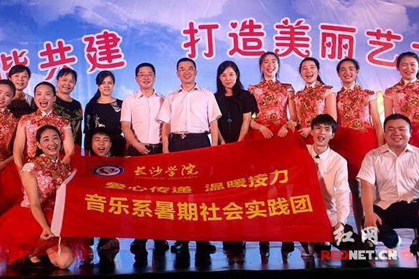 长沙县路口镇政府、路口社区与长沙学院音乐系联合开展文艺汇演,丰富村民文化生活。长沙学院音乐系学生社会实践团队来到路口镇路口社区,利用暑假教授村民们歌曲和舞蹈,并精心准备节目,积极筹备消夏晚会。在10多天的时间里,社会实践团队的学生们与路口社区工作人员、社区辖内各企事业单位、社区居民一起,共同打造了这台晚会。晚会集歌唱、舞蹈、相声、快板等农民群众喜闻乐见的表演形式和耳熟能详的节目内容为一体,受到当地群众的热烈欢迎。