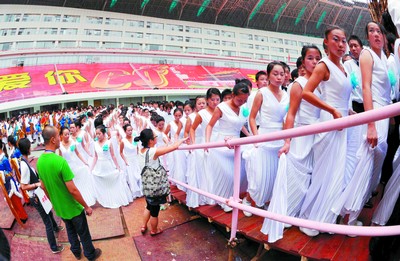 来自湖南外国语职业学院的马平在帮好友陈杰拍照的空隙接受了记者的采访。他说,这一刻,作为一名参与者觉得非常幸运,非常激动。他特意买了一个专业的佳能照相机。来自湖南第一师范学院的颜同学则在展演前一天坐了两个小时的公交车向朋友借了相机,目的也一样,记录这珍贵一刻。(周辉霞 实习生 陈雪英)