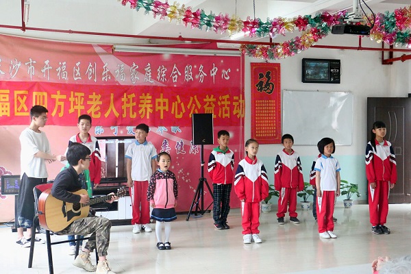 4月21日,长沙学院机电工程学院的志愿者们又准时出现在四方坪创乐福家庭服务中心,只是这一次,跟在他们身后的还有来自长沙市汉回村小学的10名少数民族儿童。孩子们虽然是第一次走进敬老院,但他们很快就和老人们熟悉并亲近起来,搀扶老人、摆放板凳、准备表演道具,孩子们显得既兴奋又有些紧张。带队前来的机电工程学院团总支书记梁莉、汉回村小学少年先锋队辅导员陈琼超告诉老人们,为了做好这次慰问表演,大小志愿者们在一起准备了近半个月时间,认认真真排练了合唱、舞蹈、朗诵等节目,希望让老人们感受到温暖和快乐。