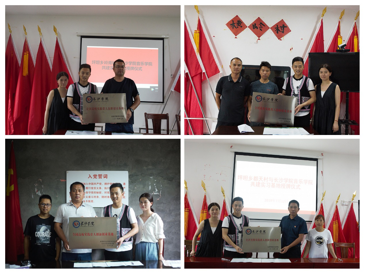 经过系列的侗族民歌传承公益活动,7月13日-14日,长沙学院音乐学院先后与通道县平坦乡平日村、都天村、横岭村、岭南村签订了村校共建协议,并在各村举行了长沙学院“实践育人创新创业”基地授牌仪式,以求持续开展音乐文化传承与文化扶贫工作。此外,长沙学院音乐学院还与皇都村侗文化艺术团签订了共建协议,确定了校团合作关系,并在艺术团挂牌“实践育人创新创业”基地。