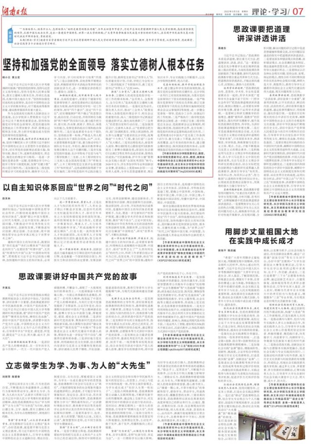 推进“三全育人”,落实立德树人根本任务。立德树人的成效是检验学校一切工作的根本标准。“全员育人、全程育人、全方位育人”是高校落实立德树人根本任务的有效路径。一是强化宣传动员,强化育人共识。推动“三全育人”政策宣传纳入各级党组织理论学习、相关会议的重要内容,纳入二级党组织书记抓基层党建述职评议,强化高校教职工“三全育人”的思想自觉和行动自觉。二是加强顶层设计,完善育人体系。以“党委管总把方向、部门协调抓落实、学院主抓创特色、师生参与全覆盖”为要求的长沙学院,统筹推进“十大育人”工程,着力打造“三全育人”长大模式。三是突出特色亮点,彰显育人成效。舞台剧《唱支山歌给党听》获教育部关工委舞台剧最佳奖;原创红色话剧《日出湘江》等优秀作品成功首演,取得良好成效;“守民族根魂、护中华古建”暑期社会实践小组获“全国优秀团队”称号;2020年至今,学生参加学科专业和创新创业竞赛,获省级以上奖励800余项……这些育人成果,令学生思想道德素质、理论知识水平、专业实践能力不断提升,让长沙学院特色鲜明、亮点凸显。