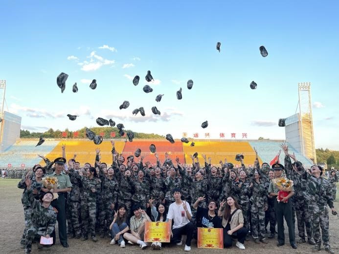 第二张:军训结束那天21级播音生和教官、班导们的合照。夏日的蝉谱着柔声的曲,国旗躺进粉雾海,最后一层迷彩湿透。听,风的声音。