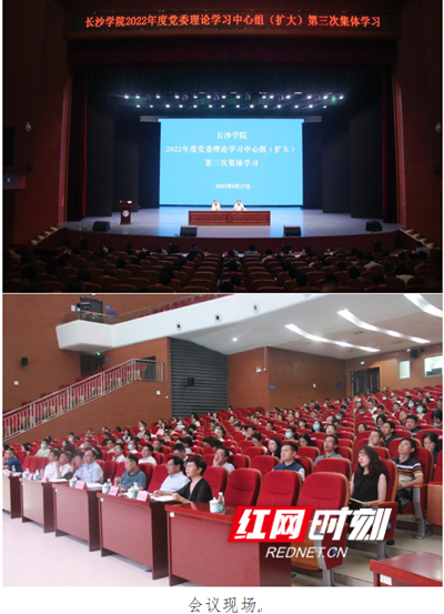 6月17日上午,长沙学院在学生活动中心组织2022年度党委理论学习中心组(扩大)第三次学习,十三届全国政协委员、湖南省政协副主席、致公党中央常委、湖南省委会主委胡旭晟同志作专题辅导报告。全体校领导、党委委员,全体中层干部,全体科级干部,副高职称以上党外知识分子参加学习,党委书记杨小云主持学习研讨会。