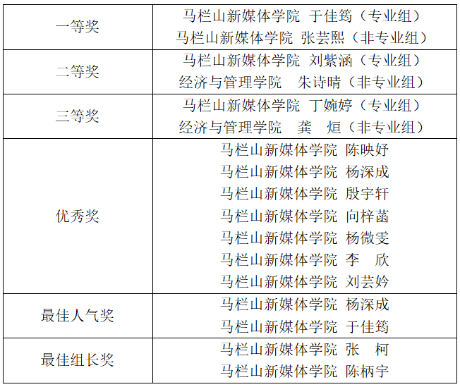 经过激烈角逐,马栏山新媒体学院的于佳筠斩获一等奖、刘紫涵获二等奖、丁婉婷获三等奖。非专业组的奖项则依据其独立赛道内的表现,平行评选出了一、二、三等奖得主,分别为马栏山新媒体学院张芸熙、经济与管理学院朱诗晴、经济与管理学院龚烜。
