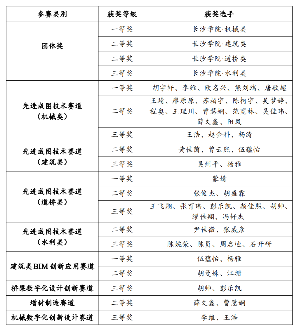 近日,第十六届“高教杯”全国大学生先进成图技术与产品信息建模创新大赛全国总决赛在重庆交通大学落下帷幕。我校机电工程学院和土木工程学院在各类赛事中共斩获近50个奖项。其中,“机械类”蝉联团体一等奖,实现三连冠;建筑类和道桥类获团体二等奖,水利类获团体三等奖。此外,我校师生在附加赛道也获得优异成绩:建筑类BIM创新应用赛道获一等奖1项,二等奖1项;道桥类桥梁数字化设计创新赛道获三等奖1项;增材制造赛道获二等奖1项,机械数字化创新设计赛道获三等奖1项。我校49名参赛选手共获得先进成图技术赛道个人一等奖6项,二等奖19项,三等奖16项,获奖数量与质量均居于省内前列,充分展示了我校新工科人才高质量培养成效。