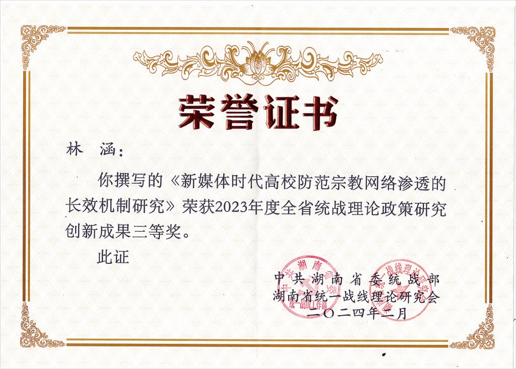 2月5日,全省统战部长会议在长沙召开。省委书记沈晓明作出批示,省委常委、省委统战部部长隋忠诚出席并讲话。会上,一批统战理论政策研究与实践创新先进集体和个人获得表彰。我校获评“2023年度全省统战理论政策研究工作先进单位”,我校《“四力通融”铸牢中华民族共同体意识》工作实践获评“2023年度全省统战工作实践创新成果”,生物与化学工程学院辅导员林涵的课题《新媒体时代高校防范宗教网络渗透的长效机制研究》获得“2023年度全省统战理论政策研究创新成果三等奖”。