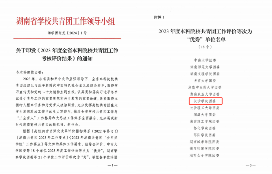 近日,湖南省学校共青团工作领导小组发文通报了2023年度全省本科院校共青团工作考核评价结果,长沙学院团委再次获评“优秀”单位,在39个本科高校考核中排名第7。