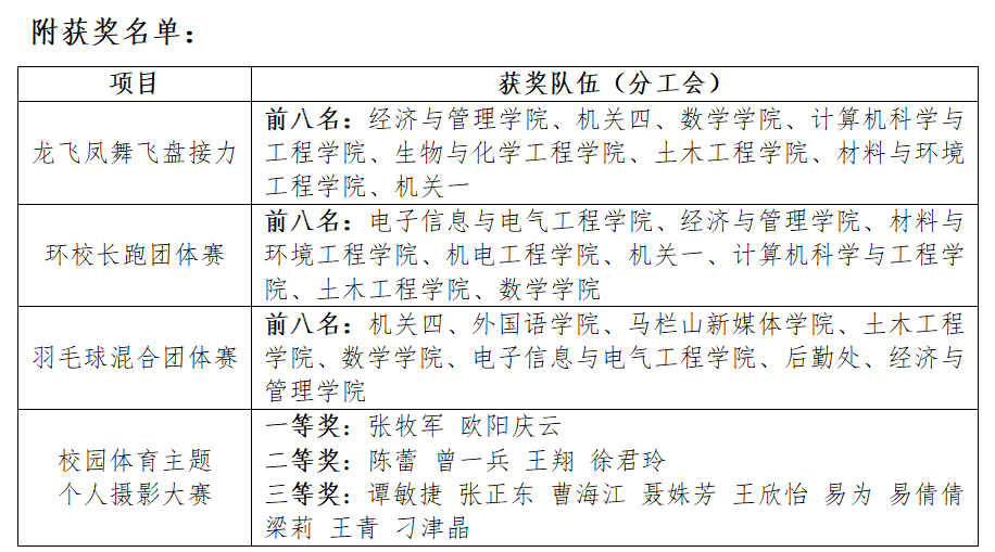 为增强教职员工身体素质,加强各单位、各分工会之间的交流,丰富教职工业余文化生活,11月8日至17日,由校工会主办、体育学院承办的长沙学院第一届教职工体育文化节顺利举行。21支教职工代表队以饱满的热情、顽强的意志共赴这场体育文化盛会,在赛场上充分发扬体育精神,发挥团队凝聚力,展现了全体教职工积极向上的精神风貌。