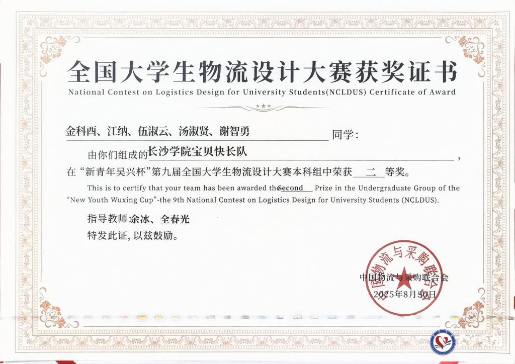 8月27日至30日,由教育部高等学校物流管理与工程类专业教学指导委员会指导、中国物流与采购联合会主办的“新青年吴兴杯”第九届全国大学生物流设计大赛决赛在浙江湖州成功举办。由我校经济与管理学院物流管理专业余冰副教授、全春光教授指导,物流管理专业金科酉、汤淑贤、谢智勇,市场营销专业伍淑云,以及机电工程学院材控专业江纳同学组成的“宝贝快长队”表现出色,凭借综合运用多学科知识解决实际问题的能力,荣获全国二等奖。