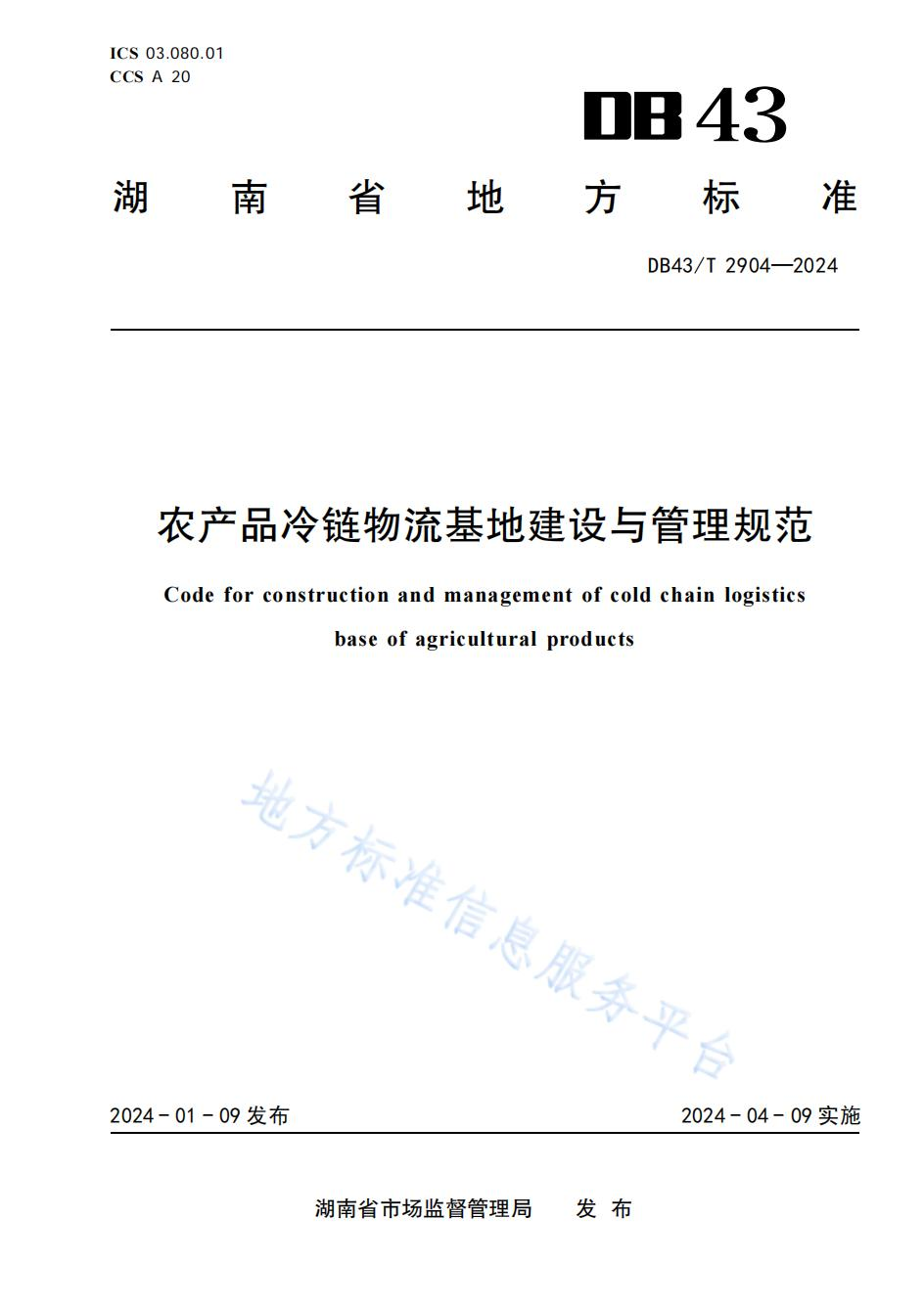 由湖南省市场监督管理局于2024年1月9日正式发布的《农产品冷链物流基地建设与管理规范》(DB 43/T 2904—2024)于今日起正式实施。该标准由湖南省发展与改革委员会提出,湖南省物流标准化技术委员会归口,湖南省冷链物流行业协会、长沙学院、红星冷链(湖南)股份有限公司、湖南黄兴冷链物流股份有限公司共同起草。