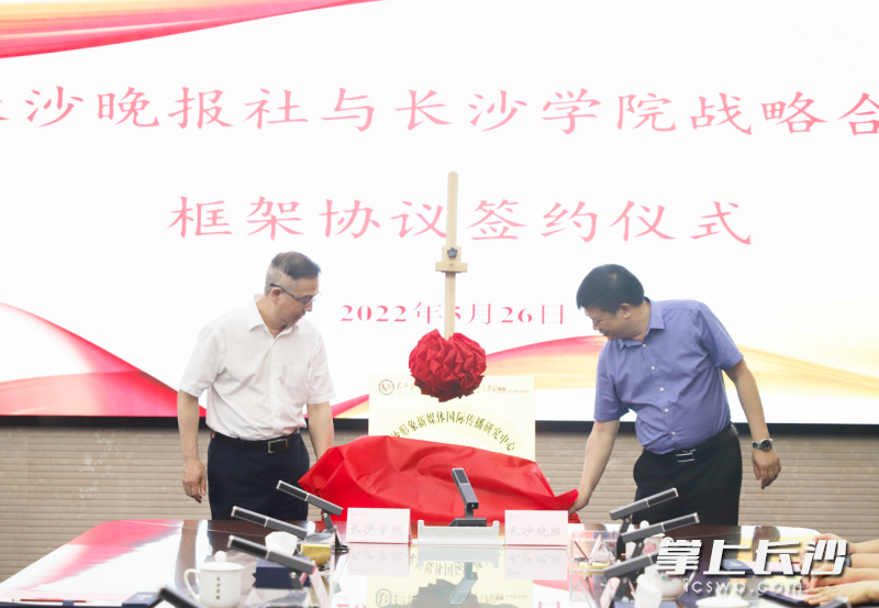 为共同推进长沙形象的国际传播,26日,长沙学院与长沙晚报社(集团公司)举行共建实践教学基地与研究中心仪式。双方将通过共建“长沙形象新媒体国际传播研究中心”“视频文创语言服务研究中心”“雷锋精神国际传播实践基地”,丰富长沙外宣的新窗口、新平台。