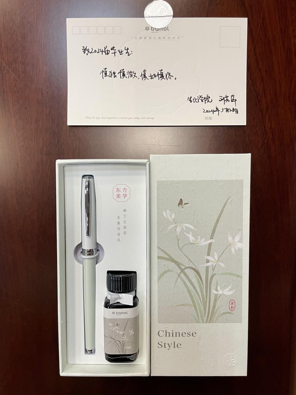 学院还为“准研究生”们准备了一份特别的毕业清廉礼——绘有“梅、兰、竹、莲”等具有清正廉洁寓意图案的“廉洁之笔”和老师们亲笔书写的学术诚信寄语卡片。“学术有道,诚信为本”“但立直标,终无曲影”“大节不可失,小节不可纵”……寄语简短,气韵深长——老师们写就的廉洁警句既是鞭策,更是期待。写满寄语的卡片整齐地展示在会场入口处的“廉”字宣传板上,白纸黑字、清清白白。老师们郑重将“廉洁之笔”交到每一名“准研究生”手上,勉励同学们在新的学术起点上执笔绘就清廉的学术新篇章。同学们争先恐后地从宣传板上取下寄语卡片,仔细品读、悉心收藏。一支富含清廉寓意的钢笔、一张承载诚信之义的卡片如同纽带一般将学术清廉和学术诚信牢牢系在同学们心间,常伴每一名考研学子的漫漫学术生涯。