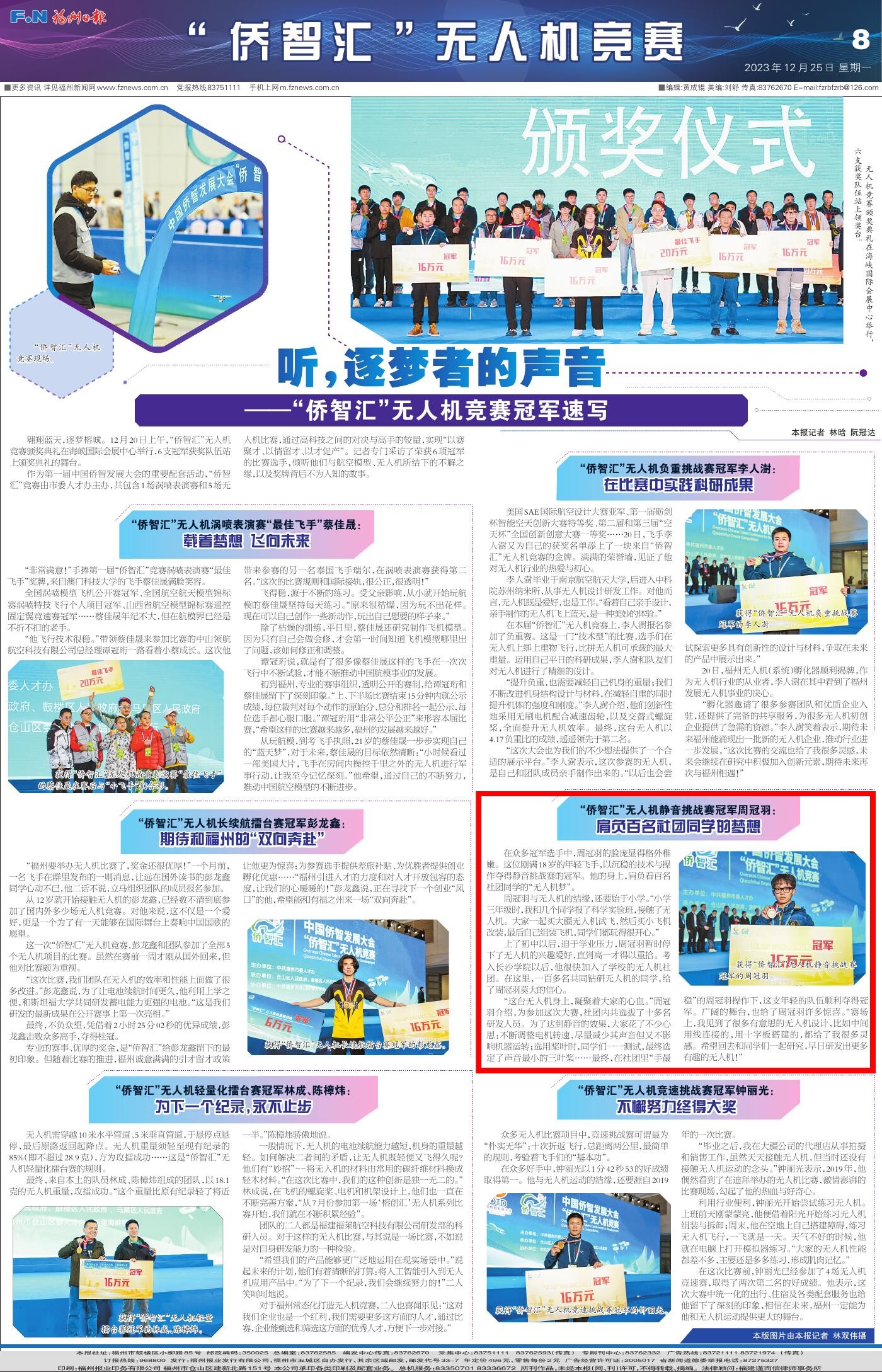 “侨智汇”无人机静音挑战赛冠军周冠羽:肩负百名社团同学的梦想