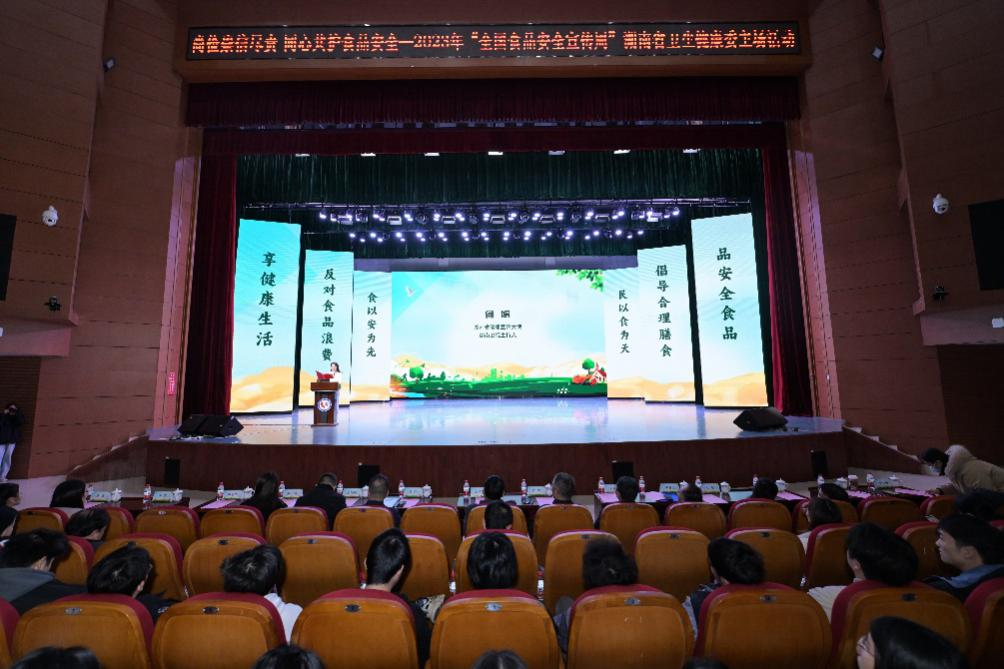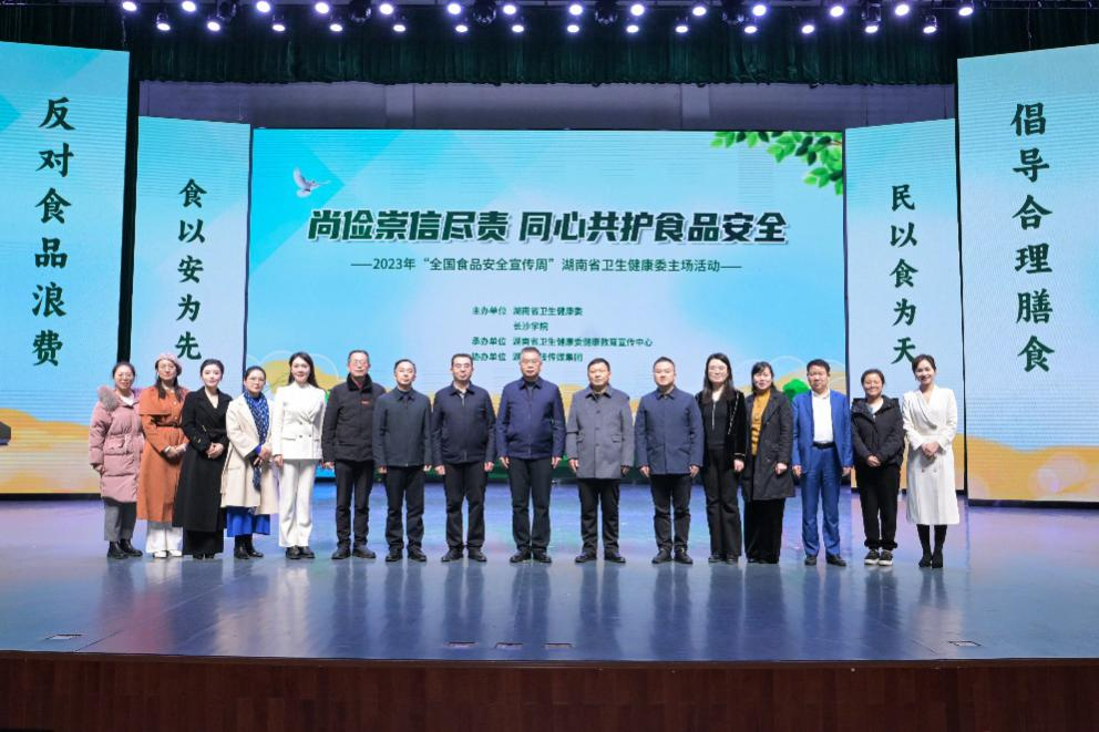 12月11日, 2023年“全国食品安全宣传周”湖南省卫生健康委主场活动在长沙学院举行。今年全国食品安全宣传周的活动主题是“尚俭崇信尽责 同心共护食品安全”,积极开展主题活动,强化食品安全人人有责、共建共治共享理念,弘扬中华民族勤俭节约的传统美德,倡导“厉行节约、反对浪费”社会风尚,切实维护三湘人民“舌尖上的安全”。