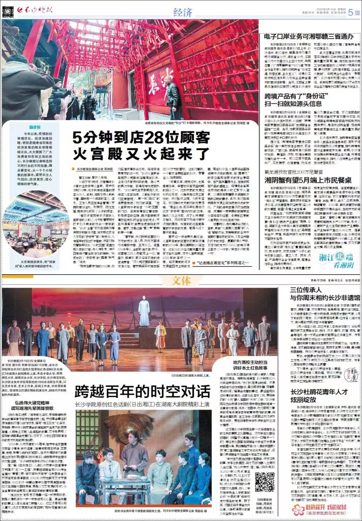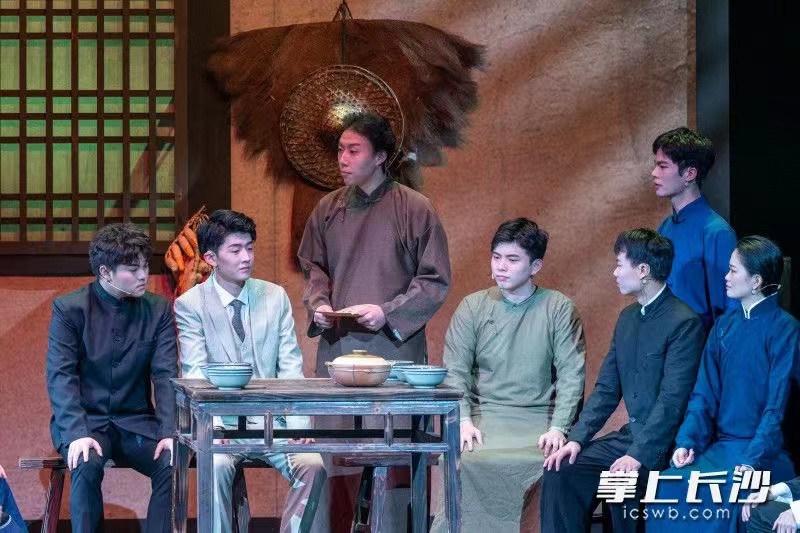 “2021年,为庆祝建党100周年,培养学生家国情怀和奋斗精神,学校组建了由青年教师王银洁、王若蘅、朱珊、张镇为主的创作团队,在多方调研学习的基础上创作出原创剧本《日出湘江》,进而带领学生排练出大型话剧。”长沙学院党委书记杨小云告诉记者。