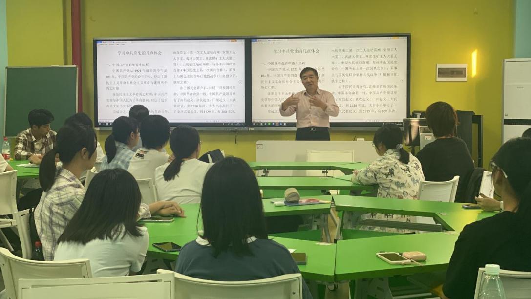 涵虚楼智慧教室内,22级法学2班的同学们正围坐在一起,认真聆听长沙学院关工委副主任戴开柱教授主讲的党课。他以党在成立之初发生的革命事件引入,阐释了党的百年奋斗历程,解答了学生的困惑,并在互动环节中与同学们开展热烈的学习研讨。“做有理想、敢担当、能吃苦、肯奋斗的新时代好青年,为建设法治社会添砖加瓦!”在场的学子纷纷表示,将在党的领导下,努力学习,以理想者、担当者、吃苦者、奋斗者的姿态,奋进新征程,诠释新青春,创造新业绩。
