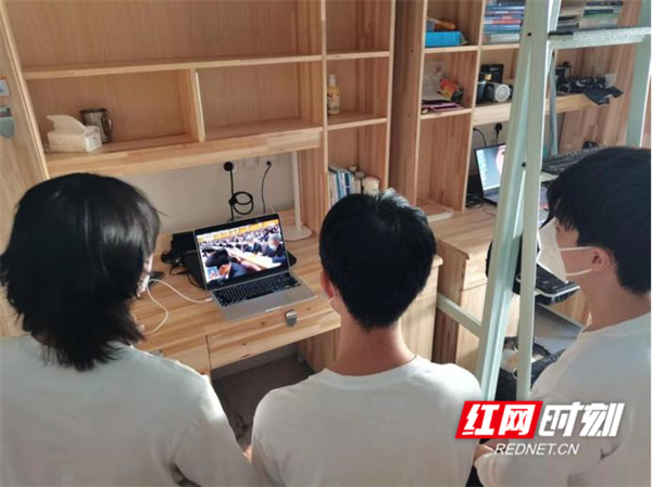 长沙学院学生在宿舍收看党的二十大开幕会。