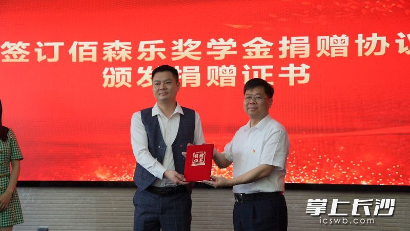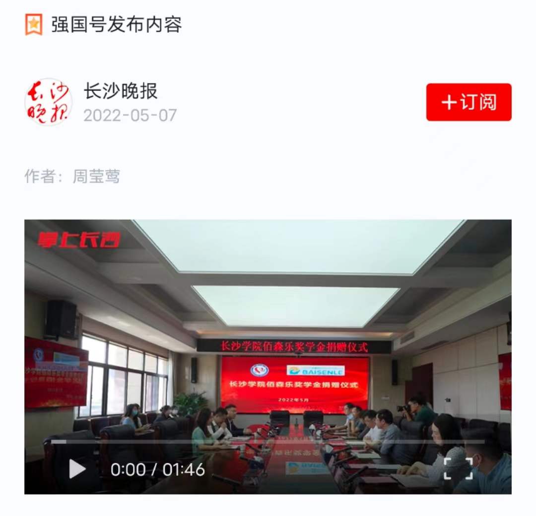 5月6日上午11时,在长沙学院举行了“佰森乐”奖学金捐赠仪式,此次捐资助学人民币十万元的企业为深圳佰森乐网络科技有限公司,该公司由长沙学院08级毕业生杨超云创办,“这次回到母校参加捐资助学活动,我感到义不容辞、责⽆旁贷也倍感荣幸。”深圳市佰森乐网络科技有限公司的创始人杨超云说。