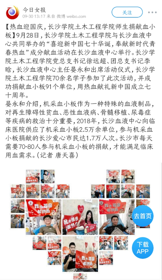 星辰在线9月30日讯(通讯员 李晗)9月28日上午8点长沙学院土木工程学院与湖南血液中心(长沙血液中心)共同举办的“喜迎新中国七十华诞,奉献新时代青春热血”成分献血活动在长沙市公共卫生中心举行。长沙学院土木工程学院该院70余名师生党员、入党积极分子参加了此次活动。