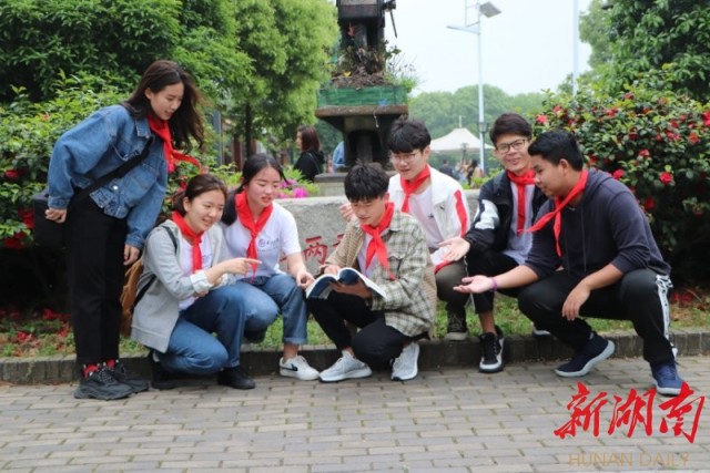 在橘子洲头,团员青年们开展寻迹游戏,即以学院特色校园文化项目—“管培素拓项目”为蓝本,将全体团员青年划分8组,每组成员在音乐喷泉广场、沁园春长沙新诗词碑、湖南省两型社会纪念馆、谁主沉浮雕像群四个指定地点,分别完成“五四青年笑脸”“诵读伟人诗词”“定格热血瞬间”“情景再现峥嵘岁月”四项任务。通过参与巧思设计的任务,大家在游戏活动中体验“爱国、进步、民主、科学”的五四精神。在洲头的毛泽东青年艺术雕像前。团员青年们齐唱国歌,瞻仰先烈,在机器人“旺仔”的带领下,重温入团誓词。